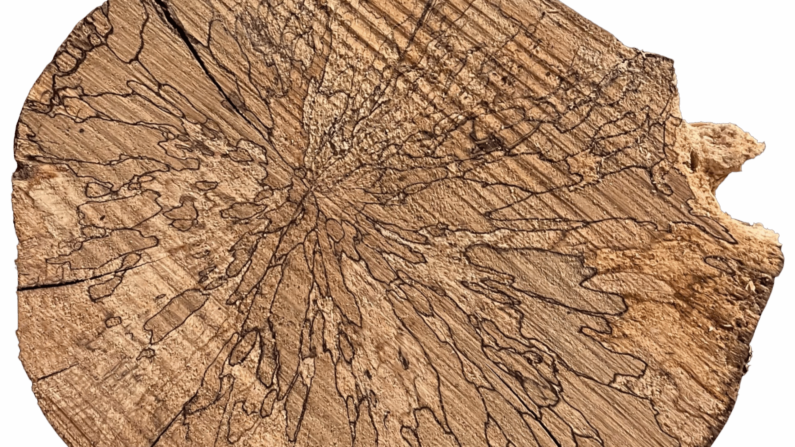 Lo spalting è un fenomeno naturale che avviene quando funghi lignicoli si sviluppano su un albero. Questi funghi non distruggono completamente il legno, ma modificano chimicamente la lignina e la cellulosa, producendo disegni visibili anche a occhio nudo.